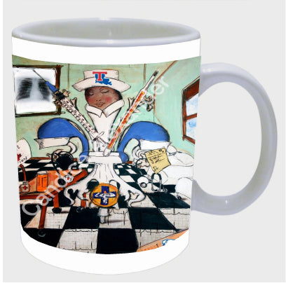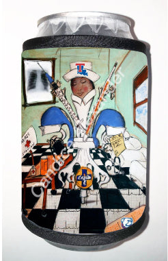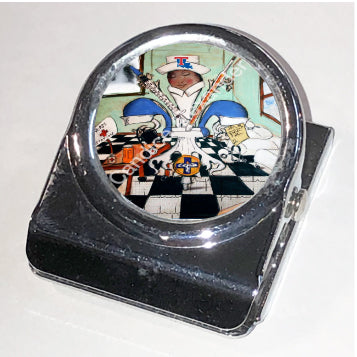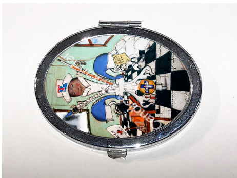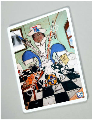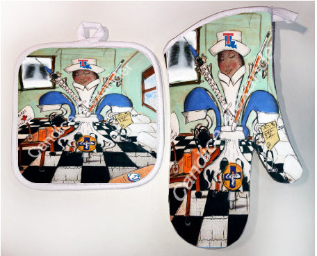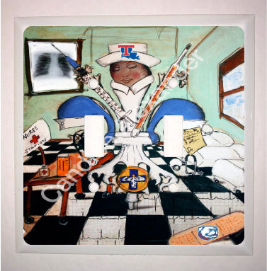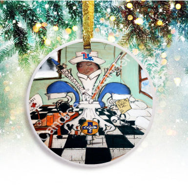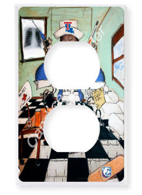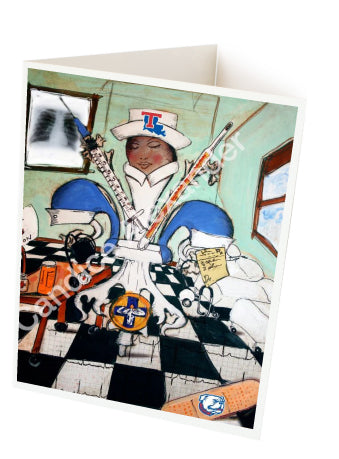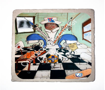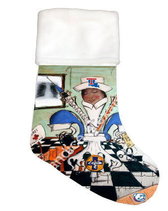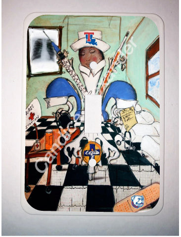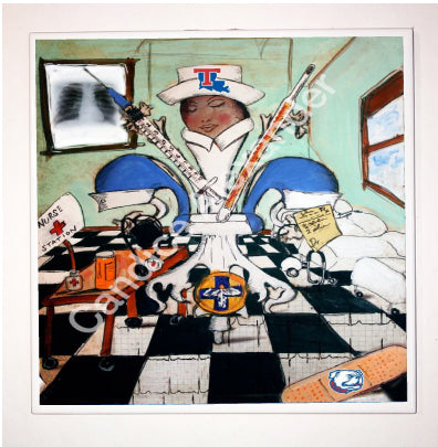 "Tech Nurse (African)" is a fleur de lis design by Candice Alexander featuring a background of a patients room in a medical facility and a central fleur in nurses uniform and embellished with medical equipment.