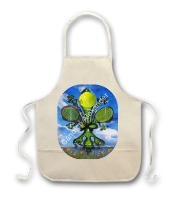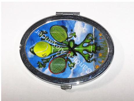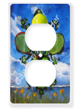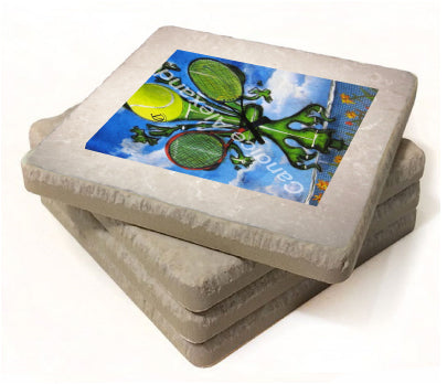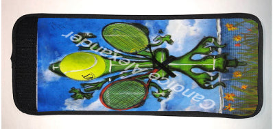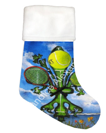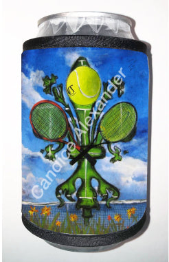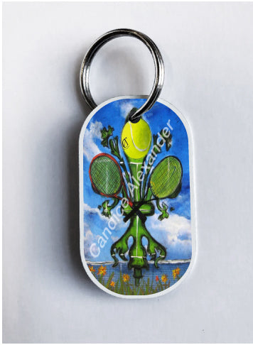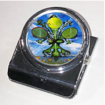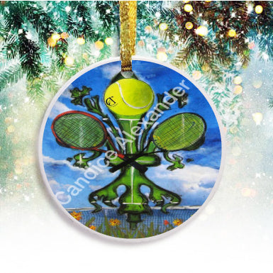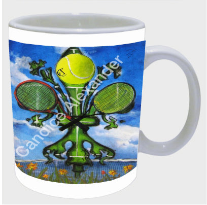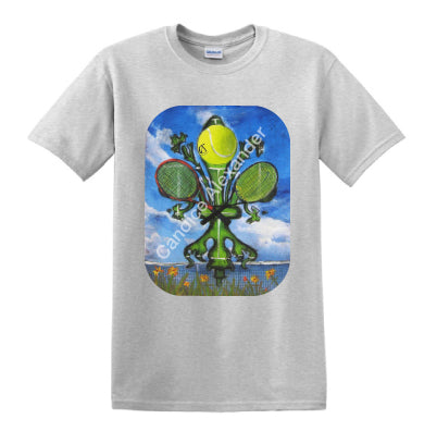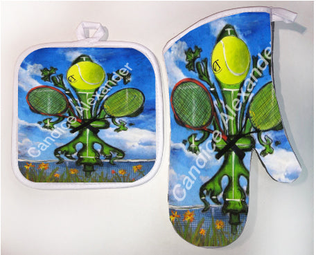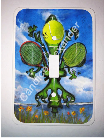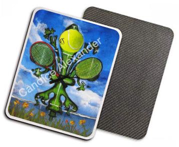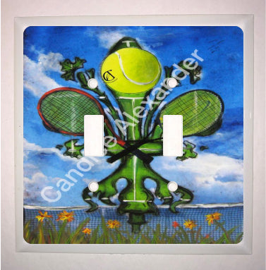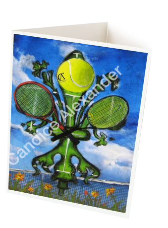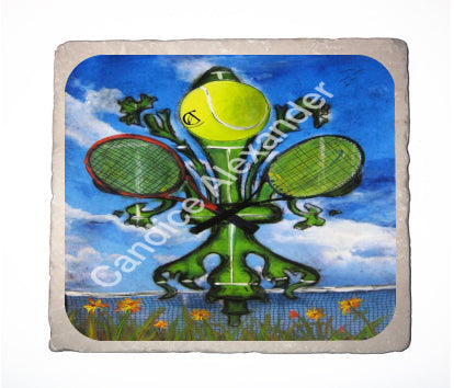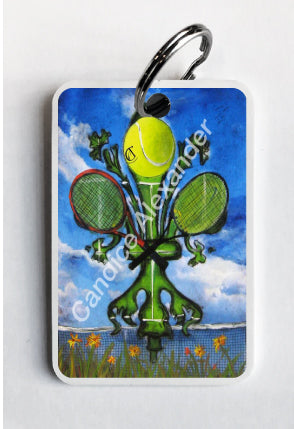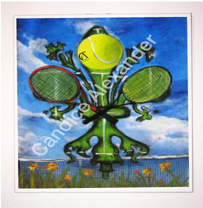 "Tennis" is a fleur de lis design by Candice Alexander featuring a landscape background with a central green fleur de lis decorated with a tennis ball and two rackets.