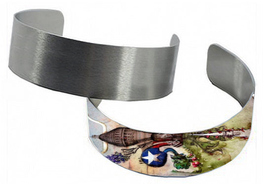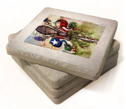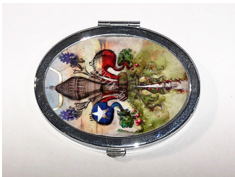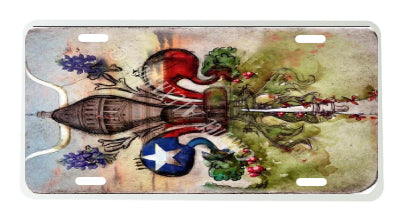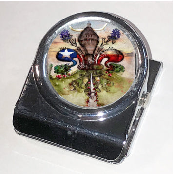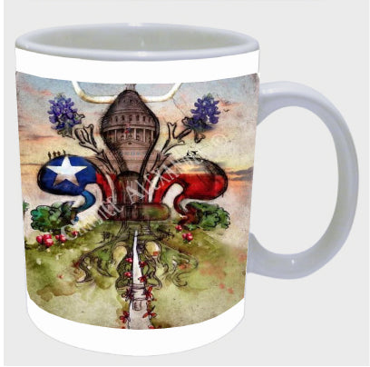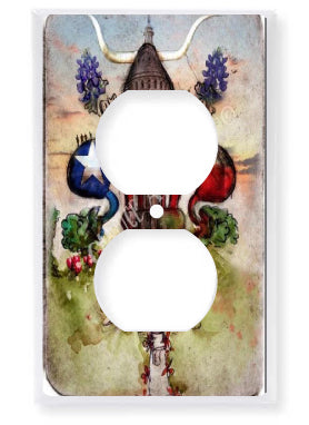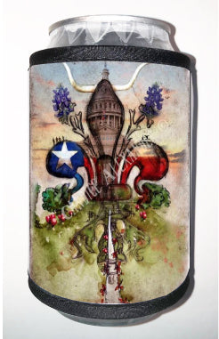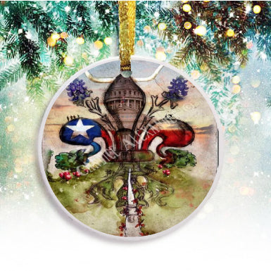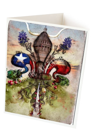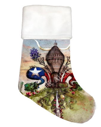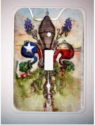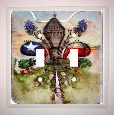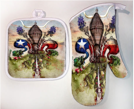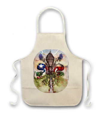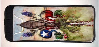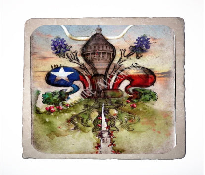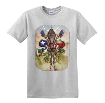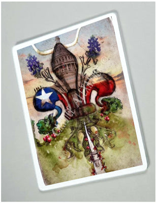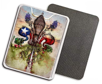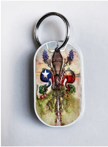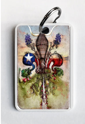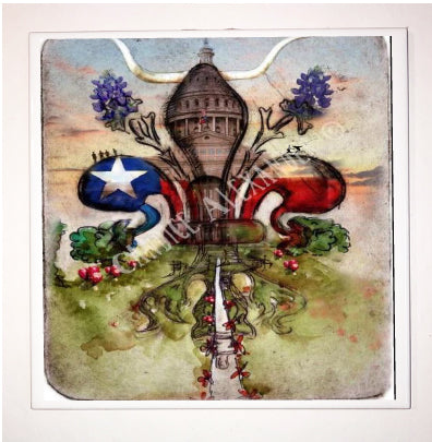 "Texas" is a Fleur De Lis Design by Candice Alexander that features a Texas landscape background with a central fleur made up of the state capitol, state flag, and horns.