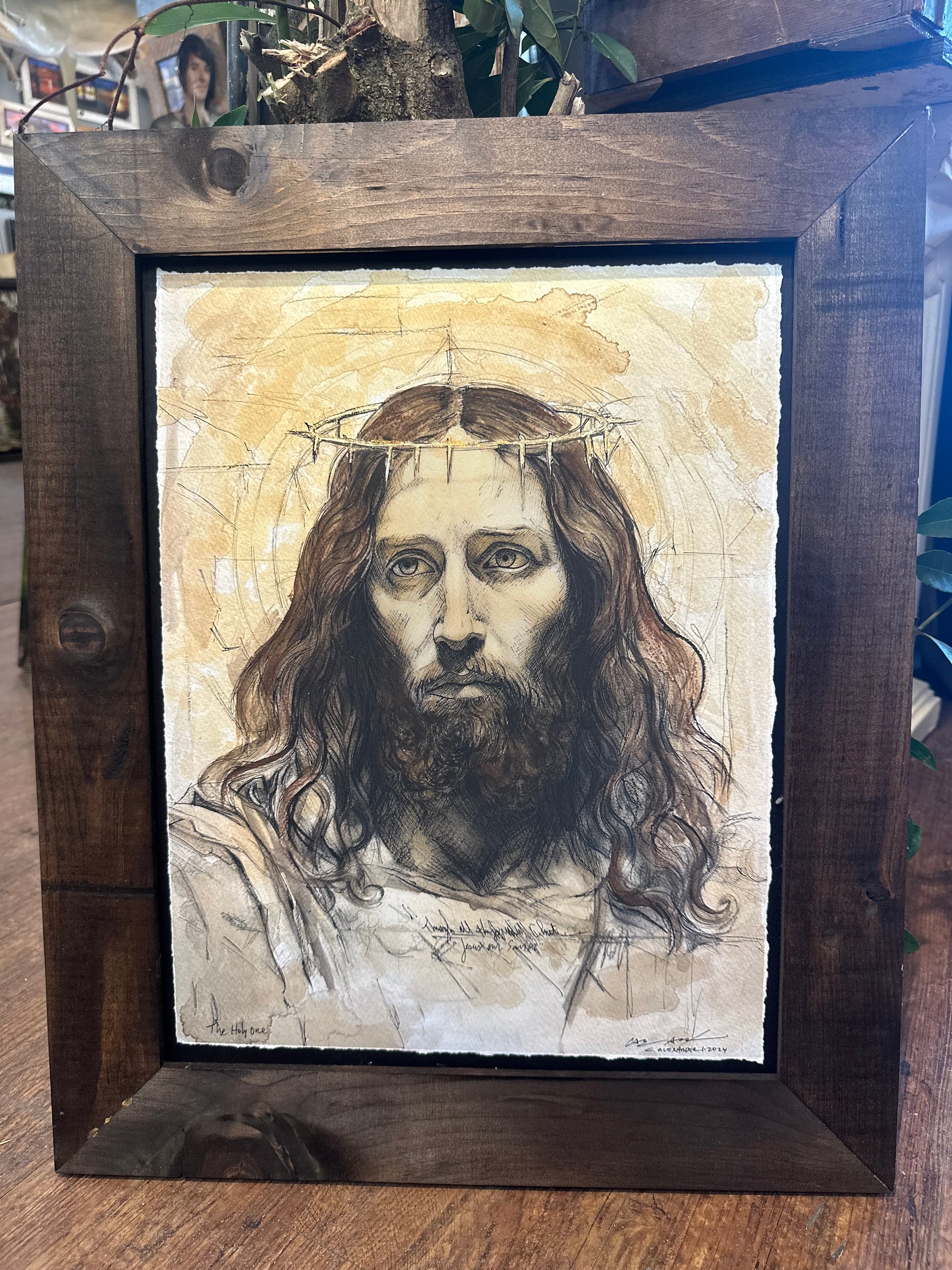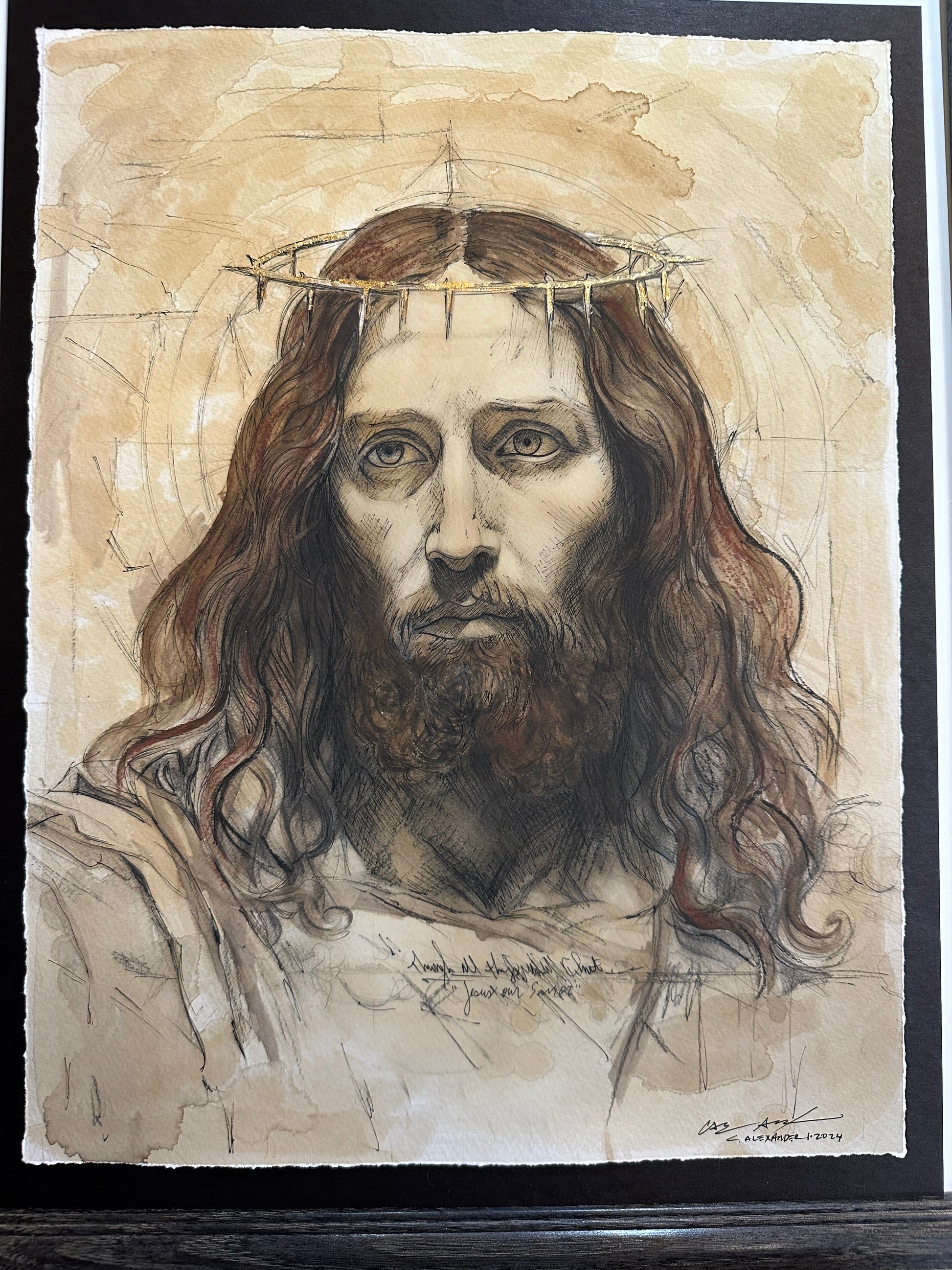 Jesus in watercolor, pencil, and pen. Using charcoal and graphite. Stained with Community Coffee.