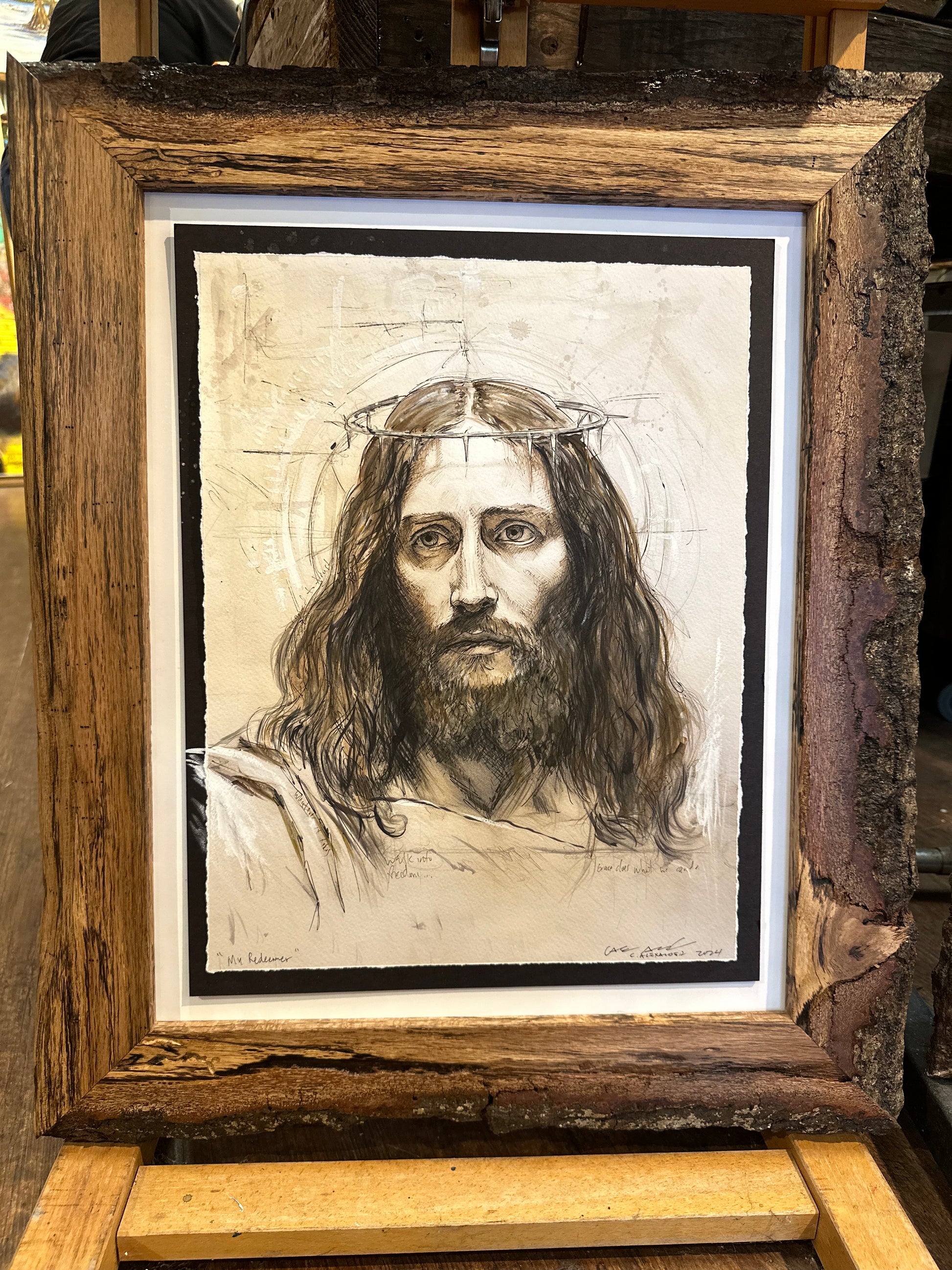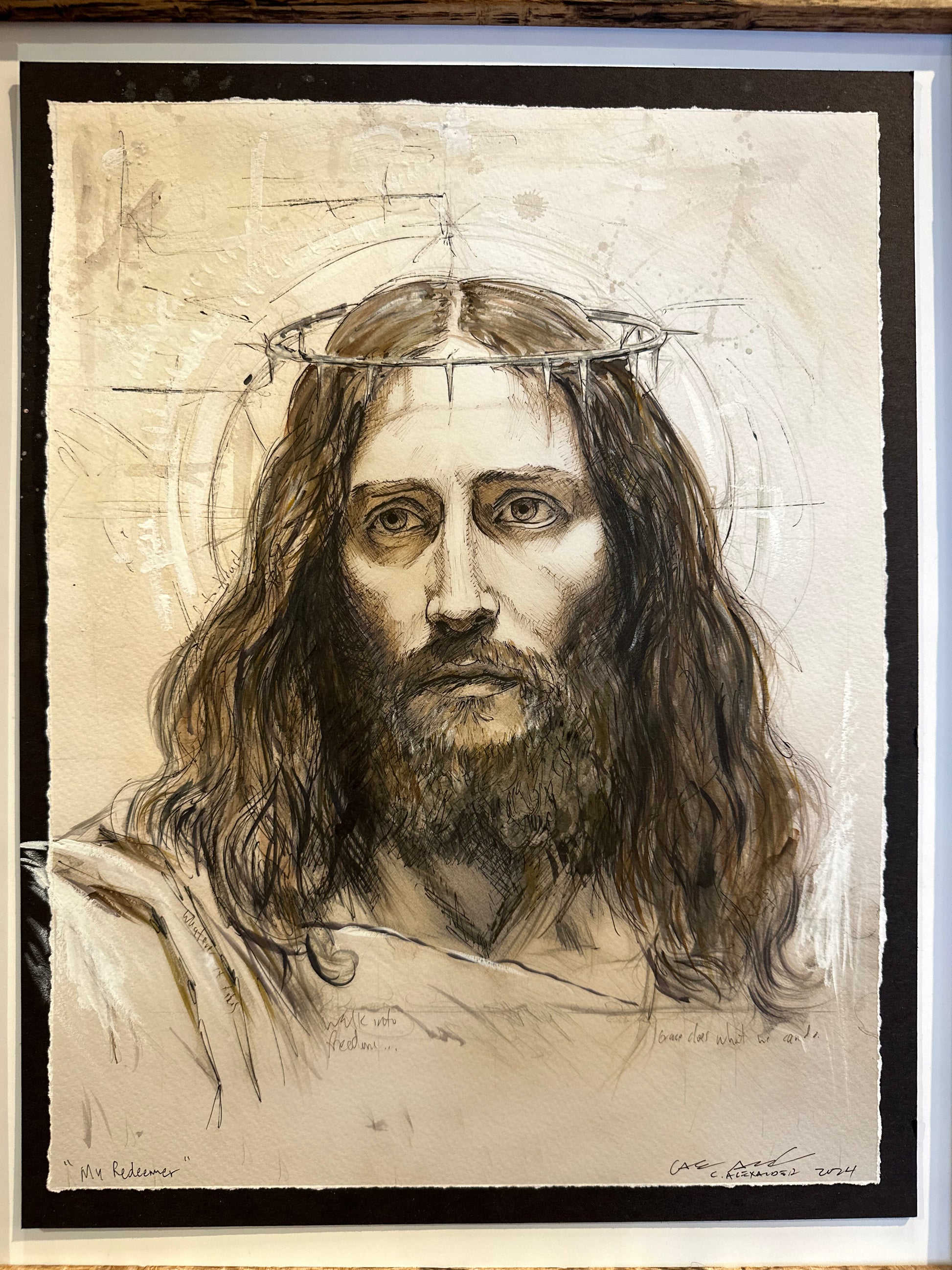 Jesus in watercolor, pencil, and pen. Using charcoal and graphite. Stained with Community Coffee.