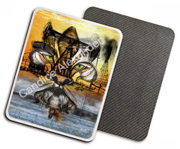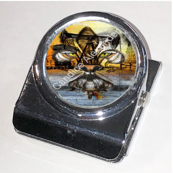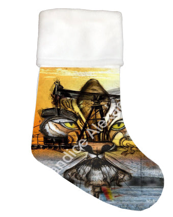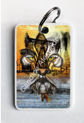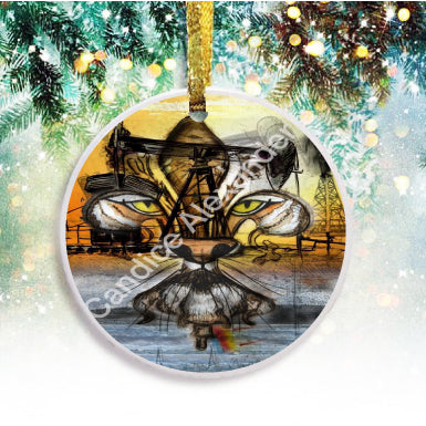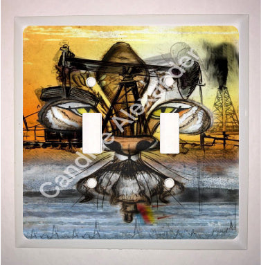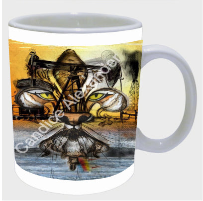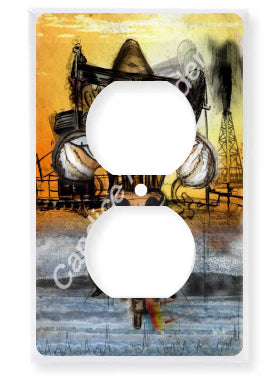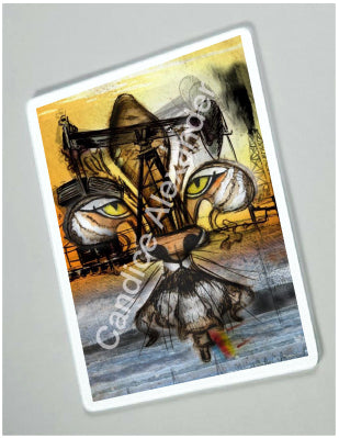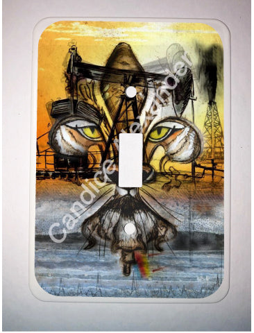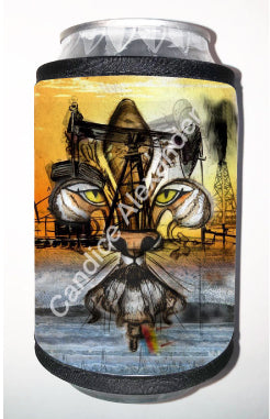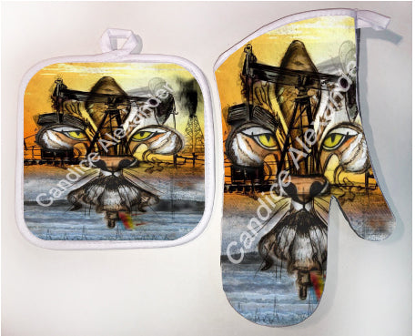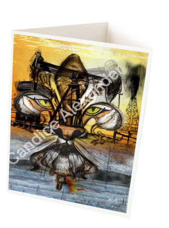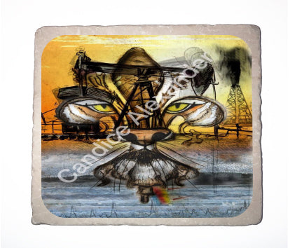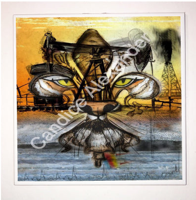 "Tiger Oil" is a fleur de lis design by Candice Alexander that features a sunset colored background with evidence of oil fields and a central tiger fleur with an oil pump emblazoned over it.