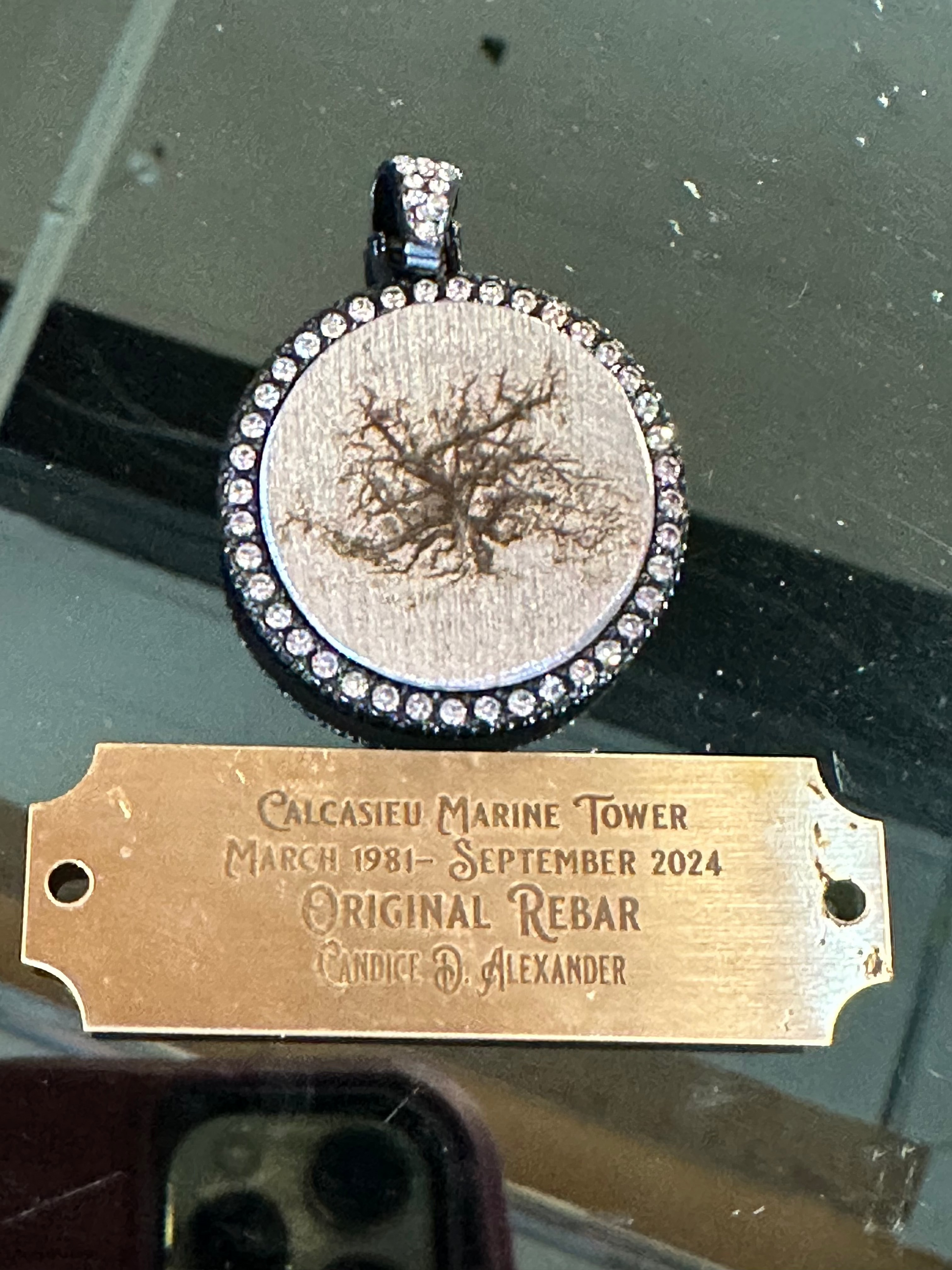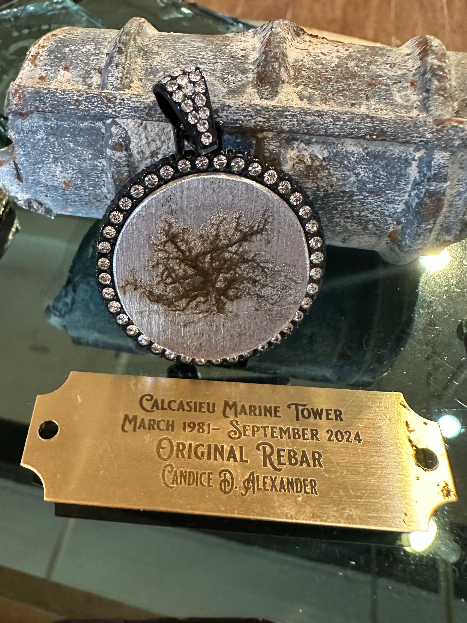 These original rebar medallions are crafted from the rebar salvaged from the iconic Calcasieu Marine Tower, preserving a tangible piece of the building’s rich history. Each medallion is uniquely engraved, showcasing images of the structure either in its stages of construction or as it stood during the demolition process. The intricate designs symbolize the evolution and enduring legacy of this landmark. These half dollar sized medallions can also be transformed into wearable pendants, offering a meaningful connection to the architectural heritage of Southwest Louisiana. All medallions have CM ReBar engraved on the one side. Perfect for collectors and those with deep ties to the community, these pieces capture both history and resilience in a compact, artistic form.