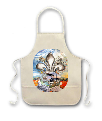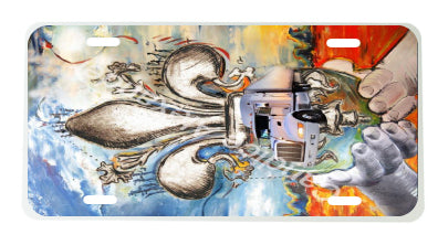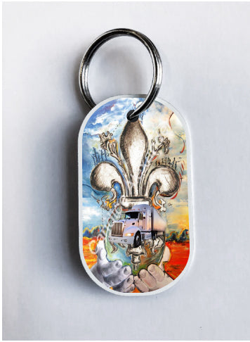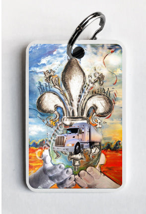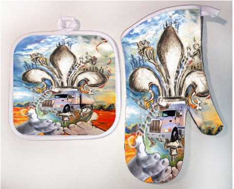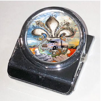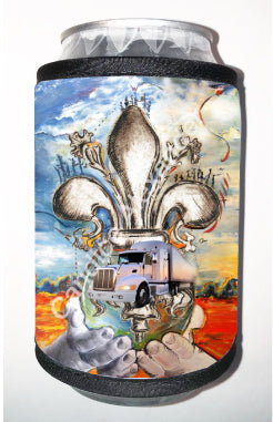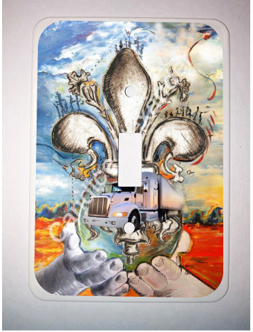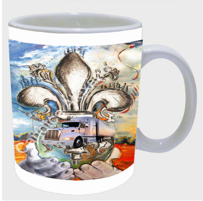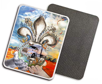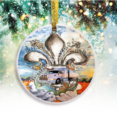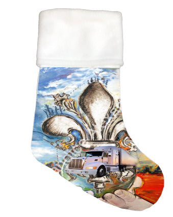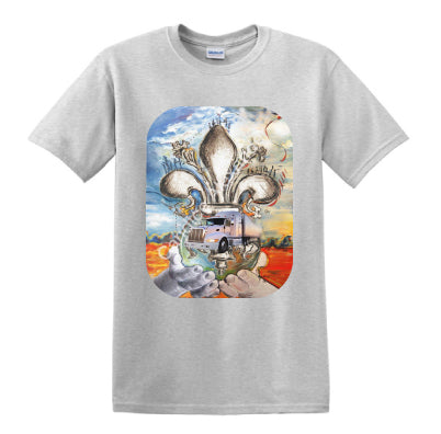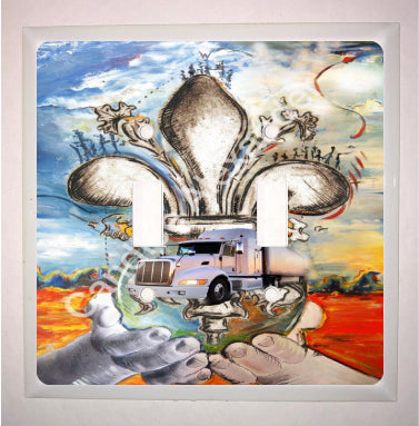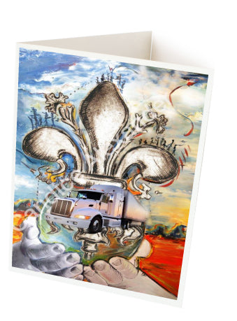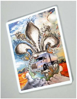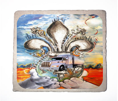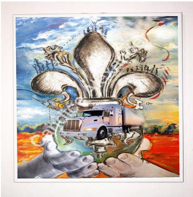"Trucker" is a fleur de lis design by Candice Alexander that features a highway background with an blue and orange sky with a ghost map across it and a central fleur de lis with asphalt texture complete with road stripes and a semi truck that links the foreground and background seamlessly.