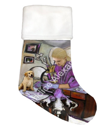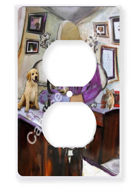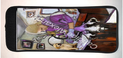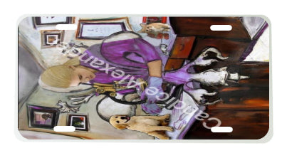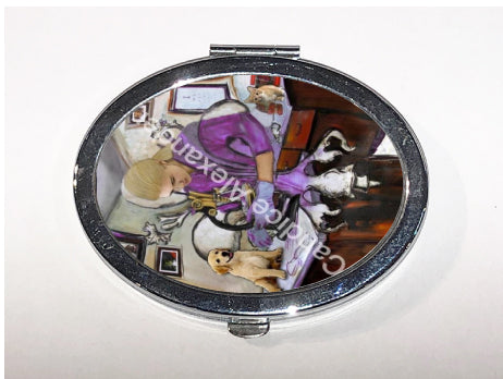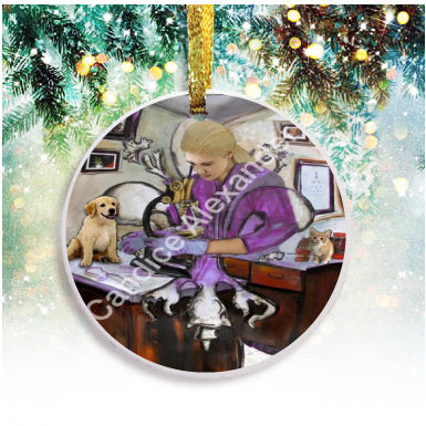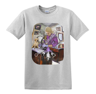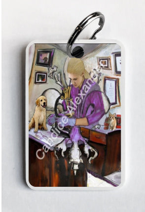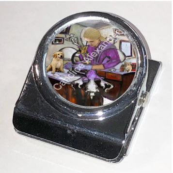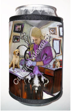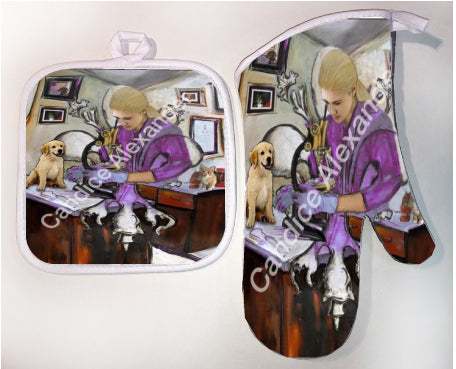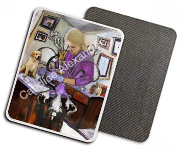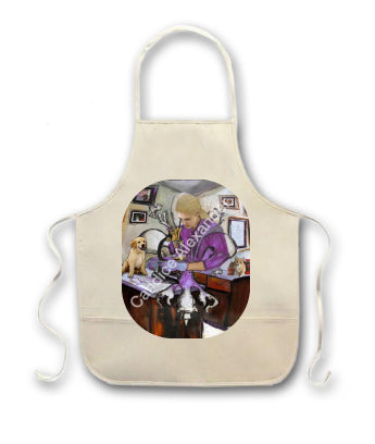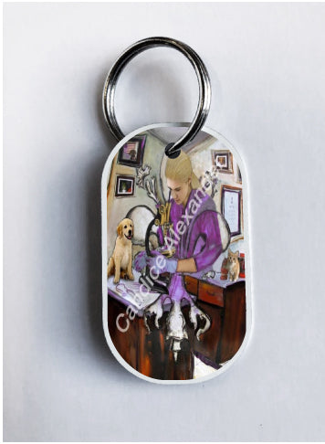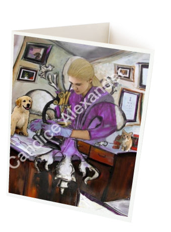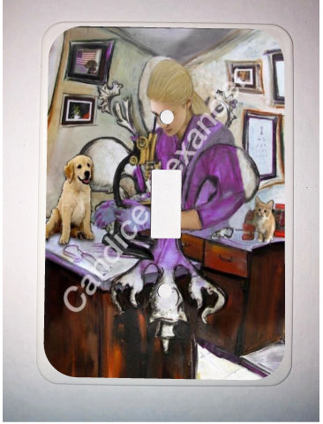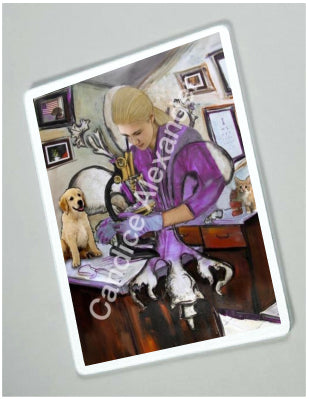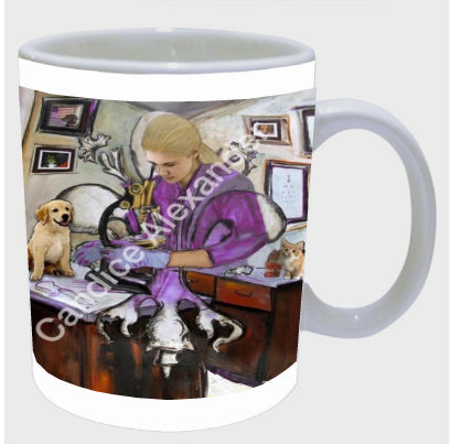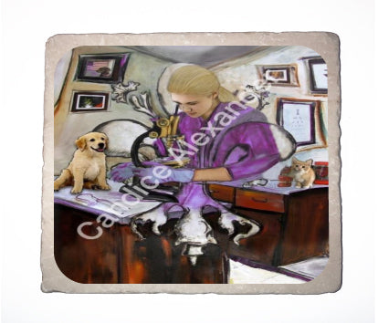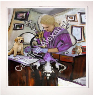 "Veterinarian Female" is a fleur de lis design by Candice Alexander that features an office setting with a central fleur dressed as the professional examining a microscope with gloves on.
