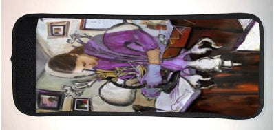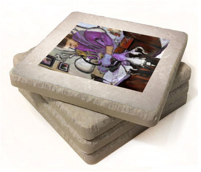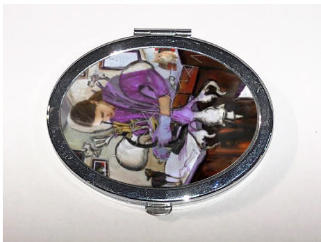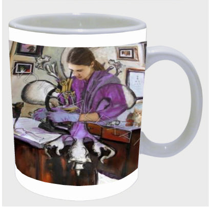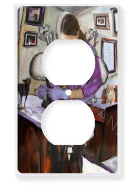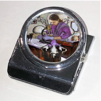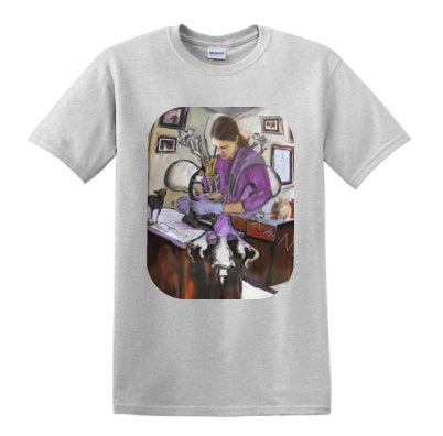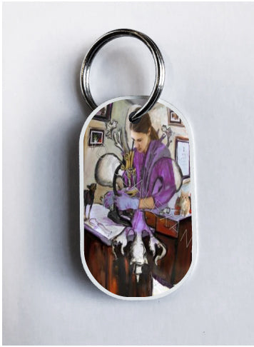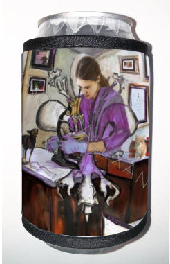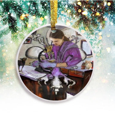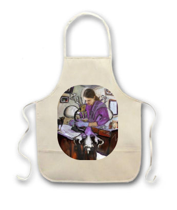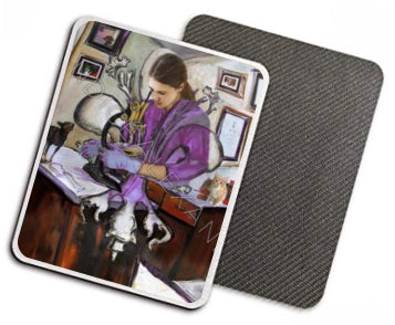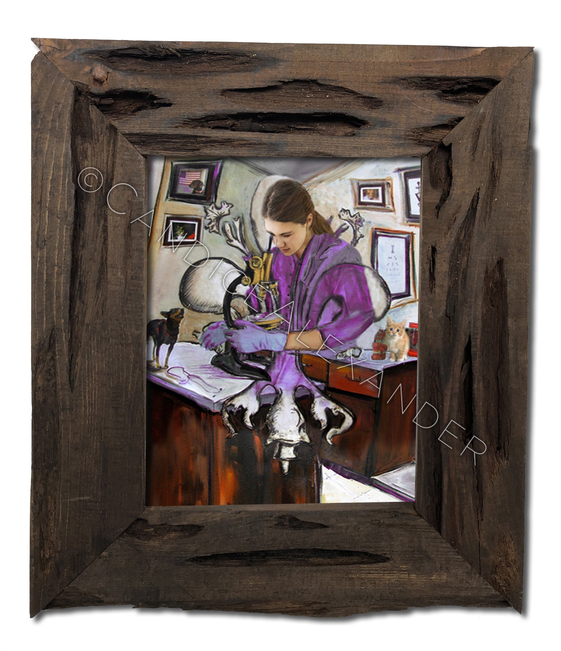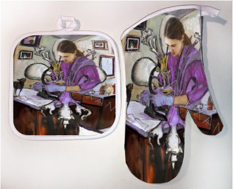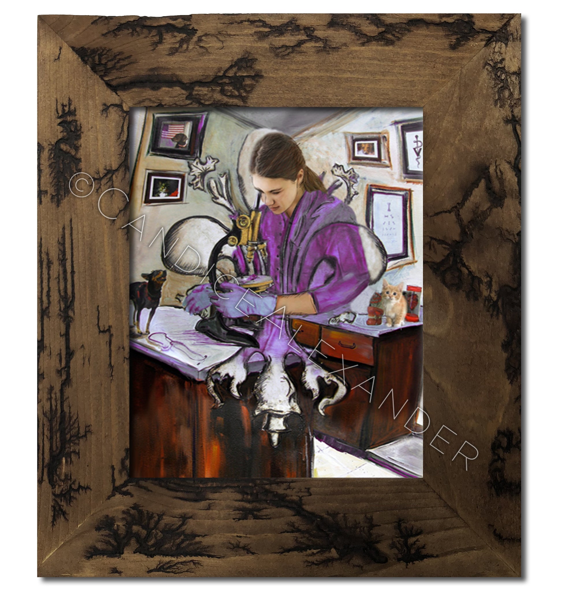 "Veterinarian Female" is a fleur de lis design by Candice Alexander that features an office setting with a central fleur dressed as the professional examining a microscope with gloves on.