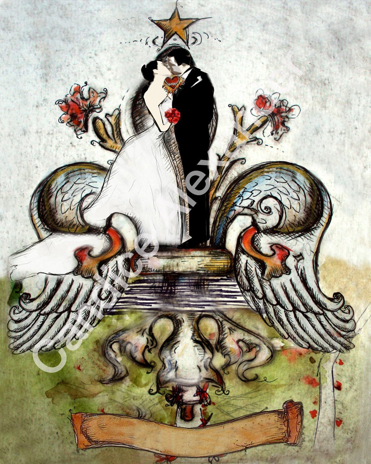 "Wedding-The Kiss" is a fleur de lis design by Candice Alexander that features a landscape background in subtle colors with a central fleur de lis with wings and altar steps with a beautiful couple centered on the steps sharing their first married kiss.