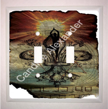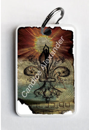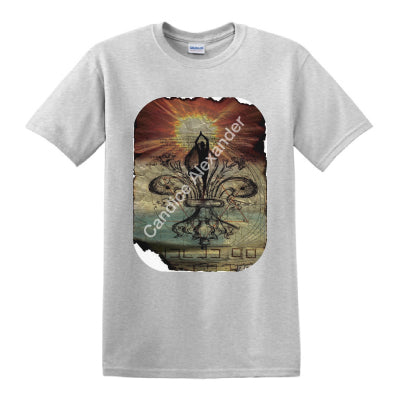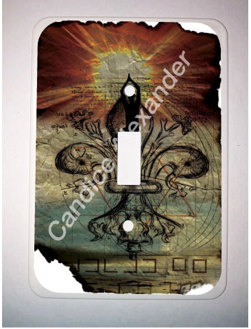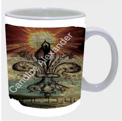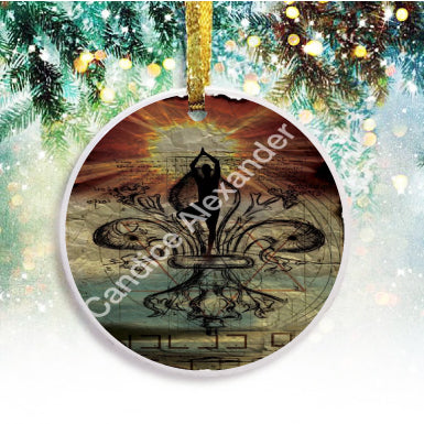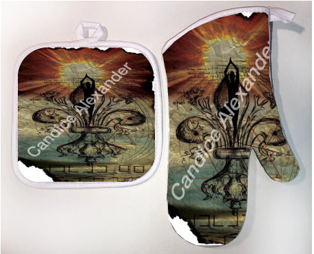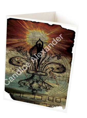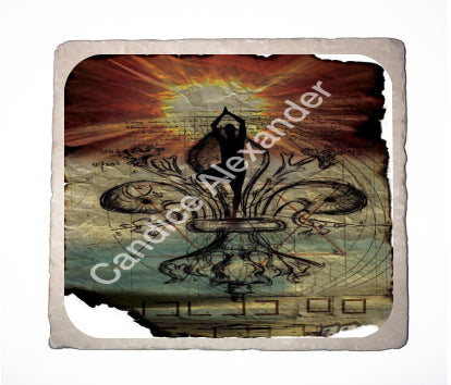 "Yoga" is a fleur de lis design by Candice Alexander that features a mandala ghosted in a muted red and beige sunbeam background with a central fleur in black with yoga silhouette imposed upon it.